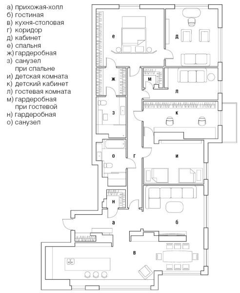 Сейчас, глядя на логично организованное пространство, сложно представить, с какими исходными данными квартиры пришлось иметь дело дизайнеру. «Квартира имеет очень специфическую, вытянутую форму, — объясняет Анастасия Горбачева, — поэтому здесь не получалось обойтись без коридора. При этом квартира щедро наделена окнами с потрясающим видом, и я решила сфокусировать внимание на них». На плане хорошо видна композиционная идея: с одной стороны коридора расположены помещения с окнами, где дизайнер спроектировала основные жилые зоны, а с другой стороны — без окон (там находятся санузлы и гардеробные). Из входного холла хозяева и их гости попадают в гостиную и кухню-столовую — открытое перетекающее пространство. Налево — приватные комнаты.