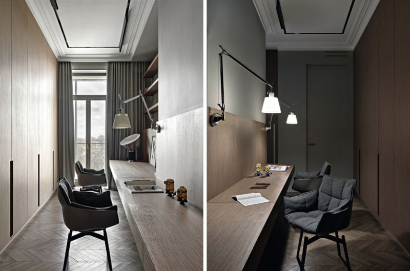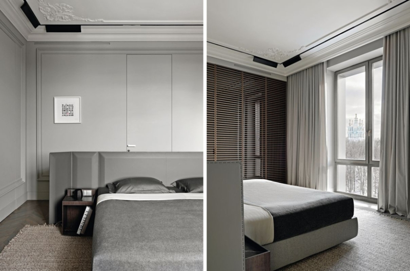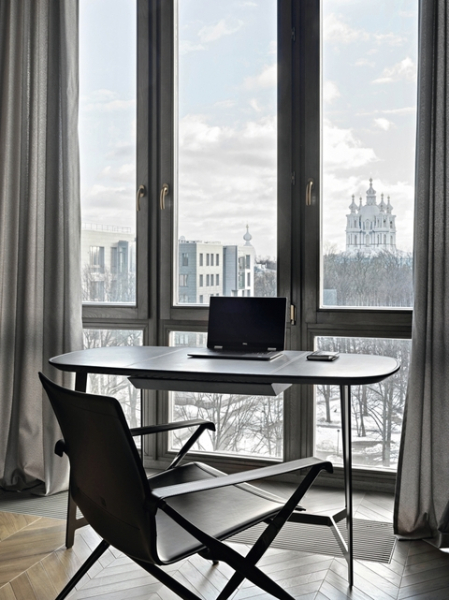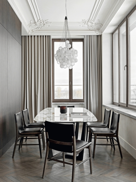 Этот медитативный интерьер совпадает по настроению с окружающей средой: и дома, и за окнами царит атмосфера спокойствия и размеренности. Она идеально отвечает пожеланиям заказчиков получить спокойный, «неторопливый» интерьер, в котором будет приятно отдыхать и набираться сил для новых свершений. Как и в самом городе на Неве, в этом интерьере сходятся прошлое и настоящее: стилизованные лепные узоры на потолке, широкие неоклассические карнизы, молдинги, паркет в укладке «французская елочка» — дань историческому прошлому, а сдержанная палитра, лаконичные формы мебели, разнообразные приятные фактуры — приемы из арсенала современности.