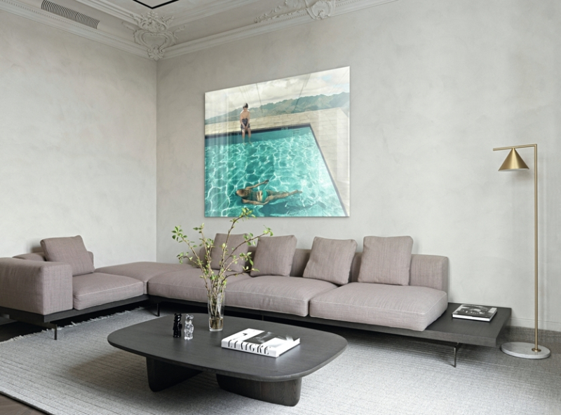 В гостиной стены и потолок отделаны декоративной штукатуркой, имитирующей отделку в старинном палаццо, и лепниной по авторским эскизам. Большой современный диван на таком фоне смотрится исключительно элегантно. Диван, журнальный столик, ковер, B&B Italia. Торшер, Flos.