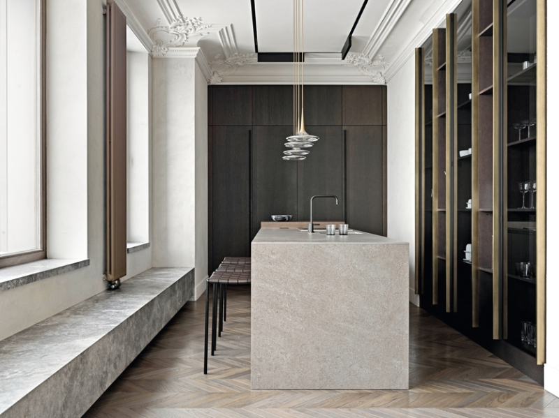 Кухонная техника максимально спрятана, зато на виду — витрины из стекла, латуни и шпона дерева. Рабочая зона организована на острове: отсюда открывается впечатляющий вид на Неву за окнами. Кухня, Arrital Cucine. Полубарные стулья, Minotti. Стулья обеденные, B&B Italia. Обеденный стол, Poliform. Люстра над столом, Luceplan. Над островом — подвесы Tobias Grau.