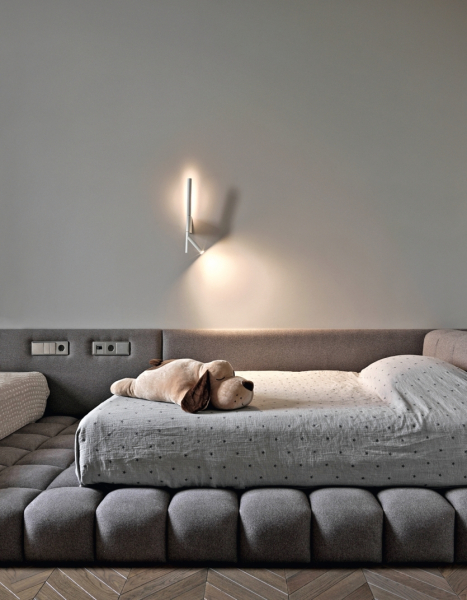 Детская и кабинет для мальчиков-погодков. Нетривиально решены спальные места в детской: вместо традиционной двухъярусной кровати (или двух отдельных) дизайнер разработала необычную кровать-подиум. Удобные матрасы, мягкие подушки спинки, а в изголовье — розетки и выключатели. Матрасы можно сдвинуть или при необходимости убрать, и тогда подиум превратится в место для игр. Кресла, B&B Italia. Лампы (в детском кабинете), Artemide. Кровать выполнена на заказ. Бра над кроватями, Estiluz.