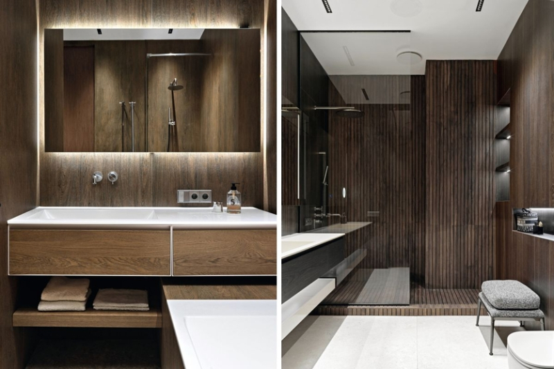 Гостевой санузел (слева) и ванная комната при главной спальне (справа) выполнены в едином стиле: лаконизм, прямоугольные формы и отделка поверхностей шпоном дерева. Сантехника, Gessi, Cielo.